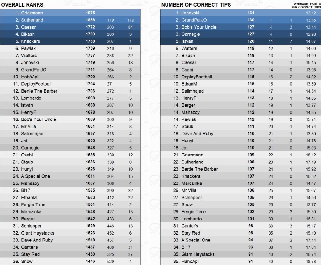 Highest Correct tipster or 5th 700